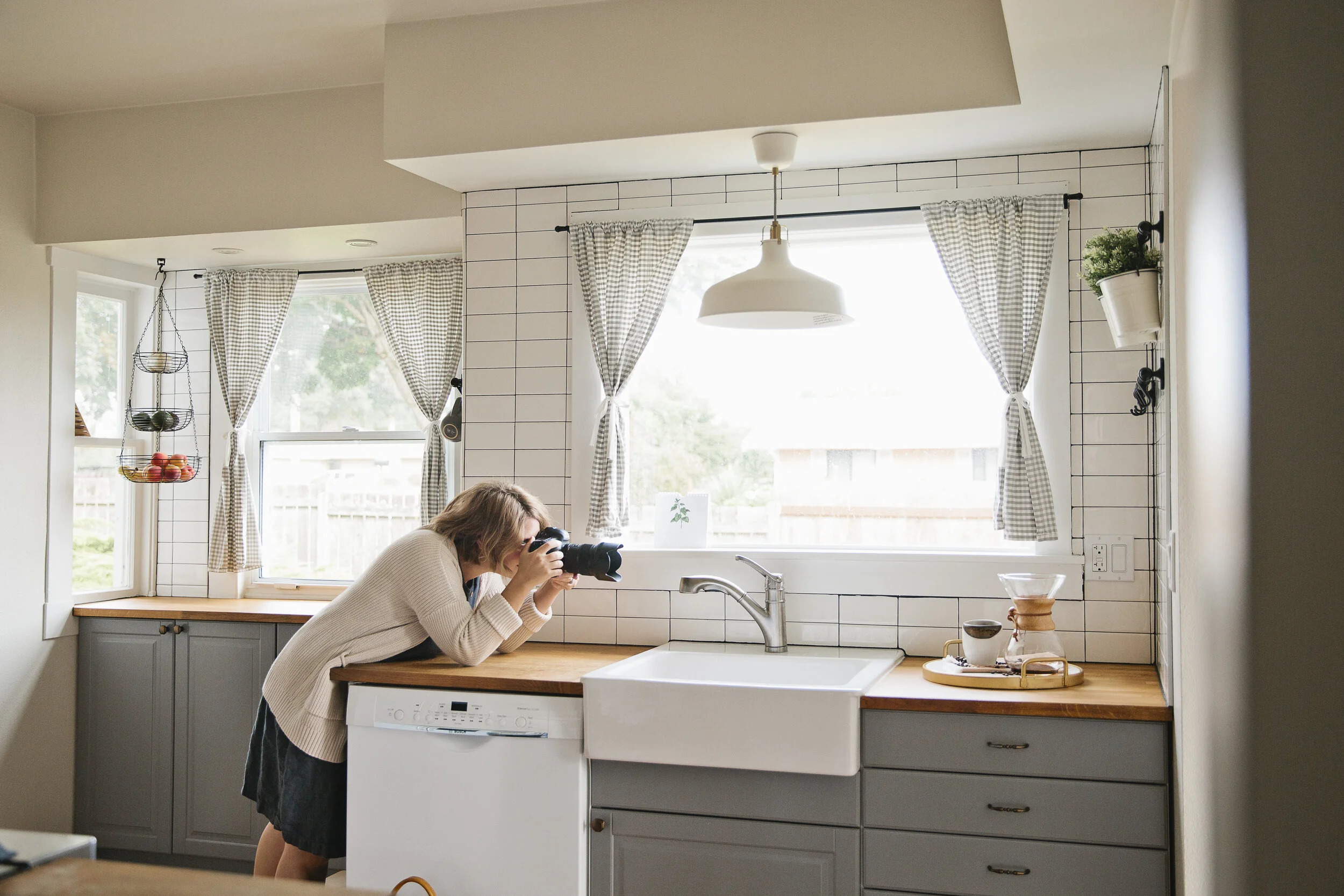Personally, my favorite type of light to use is diffused (soft) side light that is positioned slightly higher than my subject. I usually achieve this on my kitchen counter since there is a big window slightly above my counter. Below is a behind-the-scenes shot (from Lisa Monet Photography) of me using this spot in my home to photograph a scene.