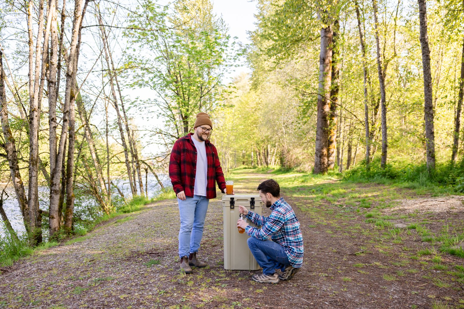 My strategy for navigating these hurdles involved a deep dive into location scouting around the Tacoma area. I eventually discovered the Riverside Disc Golf course in Sumner, which offered the perfect "off-the-beaten-path" atmosphere. It provided the lush, spring greenery I was looking for while being much less crowded than a traditional city park, allowing us to shoot freely near the river. To solve the talent dilemma, I recruited my brother, who was available during his spring break from teaching, along with a friend who worked an alternative schedule. And with the help of my client, I was able to troubleshoot some snags I’d had with the keg during my first shoot so that every pour was perfect this time around. By combining strategic scouting with creative casting and hands-on technical preparation, I was able to deliver a high-energy gallery that perfectly showcases the product's rugged, adventurous spirit.